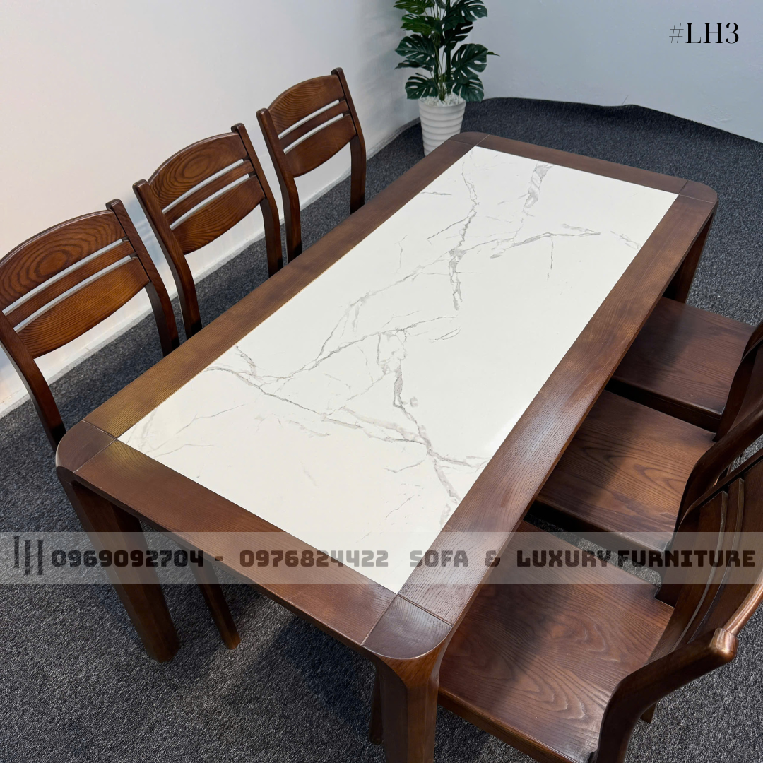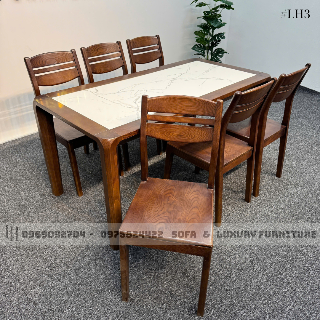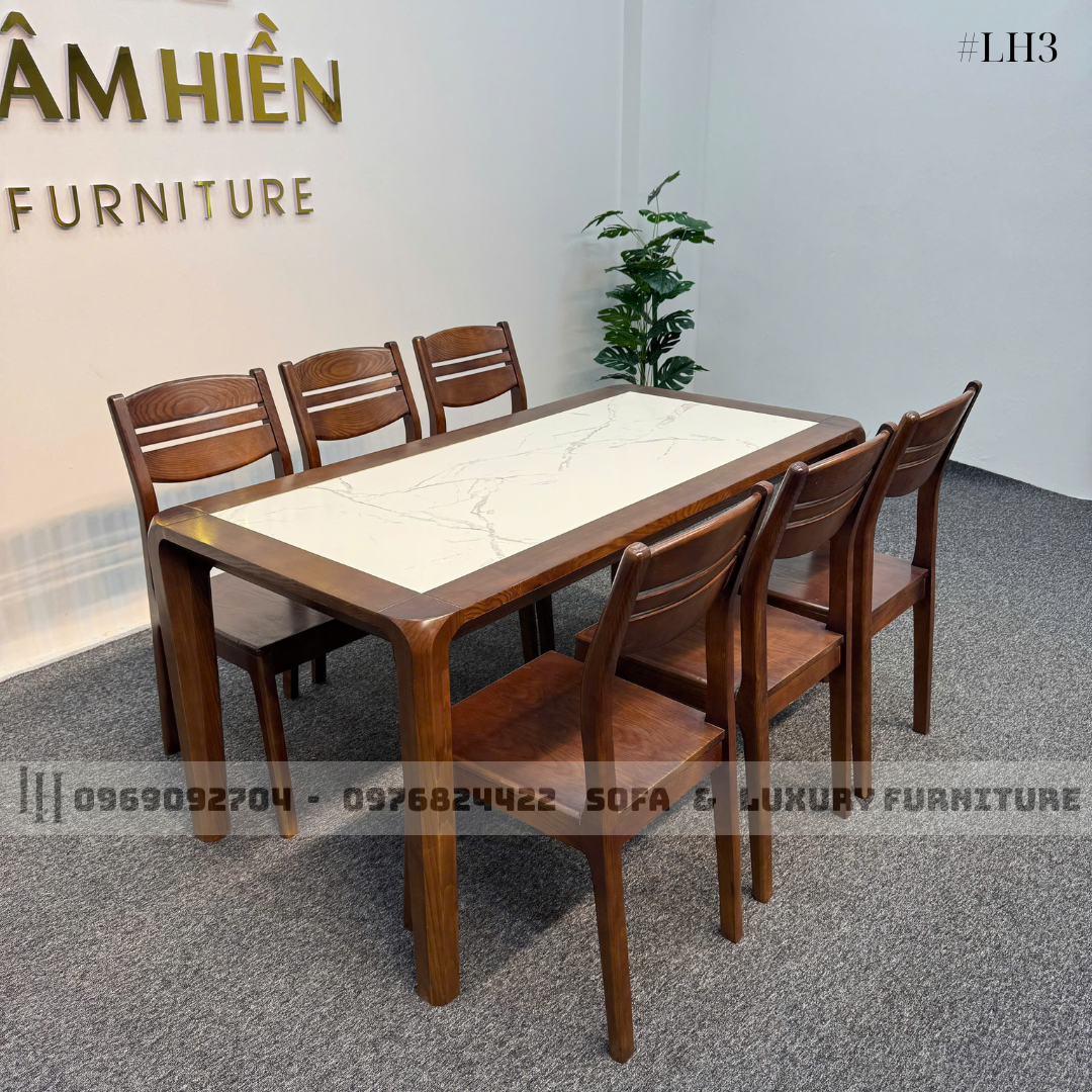 Với kích thước nhỏ gọn, bộ bàn ăn 6 ghế mặt đá LH3 là giải pháp tối ưu. Sản phẩm rất phù hợp cho các căn hộ chung cư, nhà phố có diện tích bếp khiêm tốn. Nó không chỉ đẹp mắt mà còn vô cùng tiện dụng. Đây là nơi lý tưởng để gia đình quây quần bên bữa cơm.