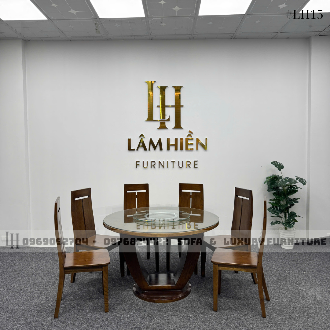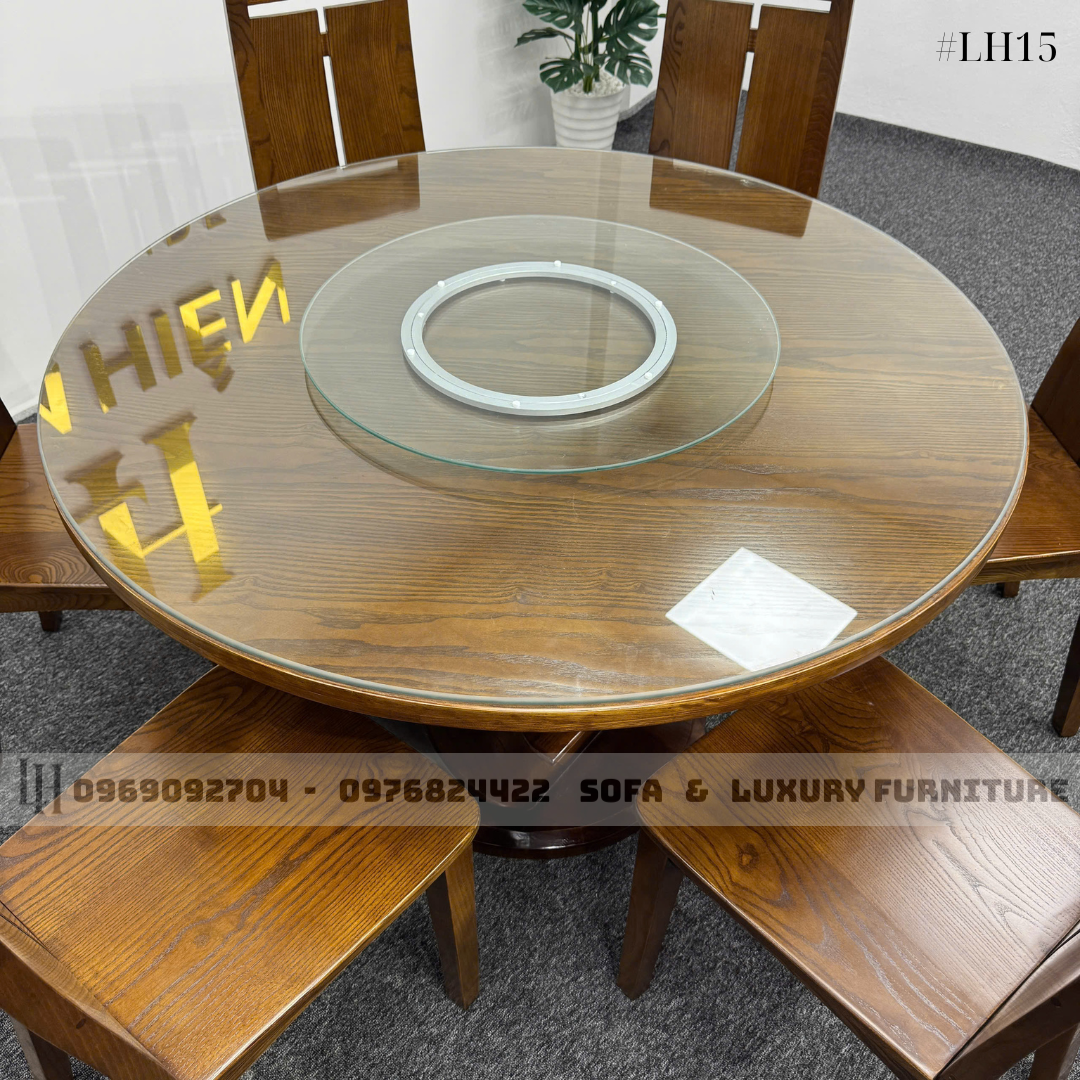 Trải nghiệm bữa cơm sum vầy hoàn hảo với bộ bàn ăn tròn 6 ghế LH15. Thiết kế mâm xoay 360 độ tiện lợi, mặt kính cường lực sang trọng. Chân trụ vững chãi, 6 ghế gỗ cao cấp tự nhiên, lý tưởng cho mọi không gian bếp.